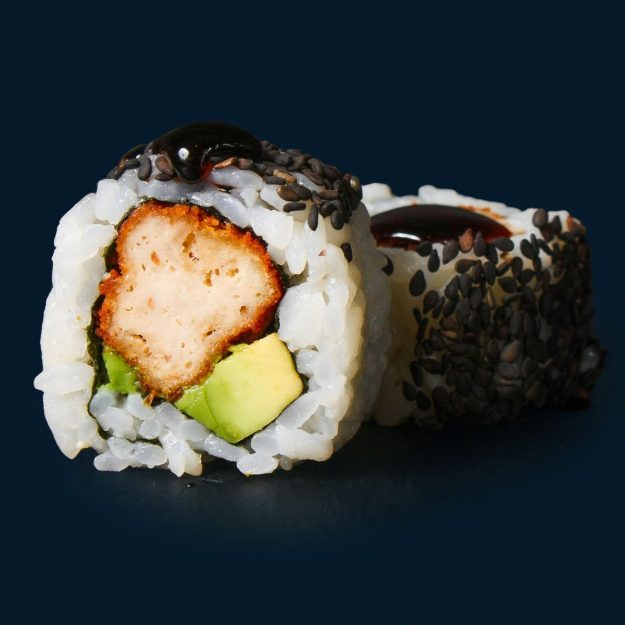 frittierte Hähnchenbrust in knusprigem Pankomehl, Avocado, schwarzer Sesam mit Teriyaki Sauce 10.3 €