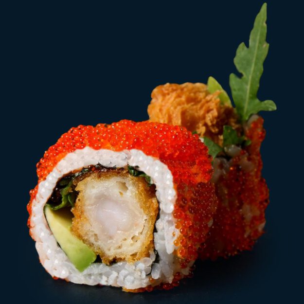 frittierte Garnele, Avocado, Rucola, Masago mit Teriyaki Sauce 11.8 €