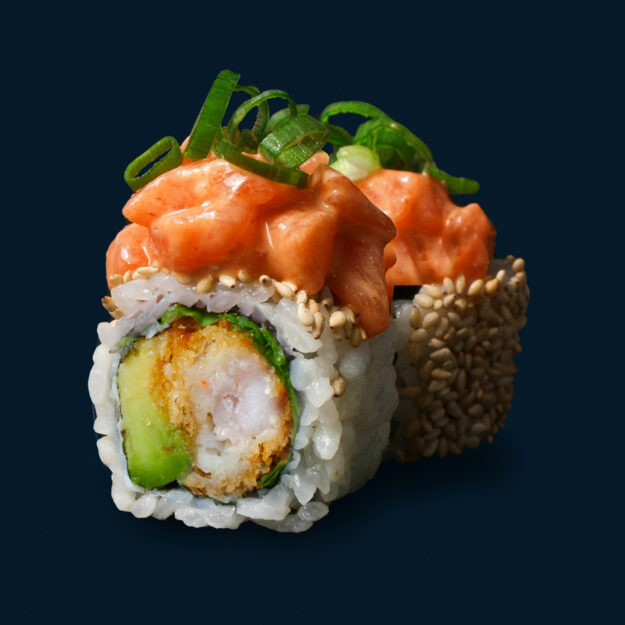 frittierte Garnele, Röstzwiebeln, Avocado Rucola mit hausgemachter Teriyaki Sauce, hausgemachter Spicy Mayo und Schnittlauch 13 €