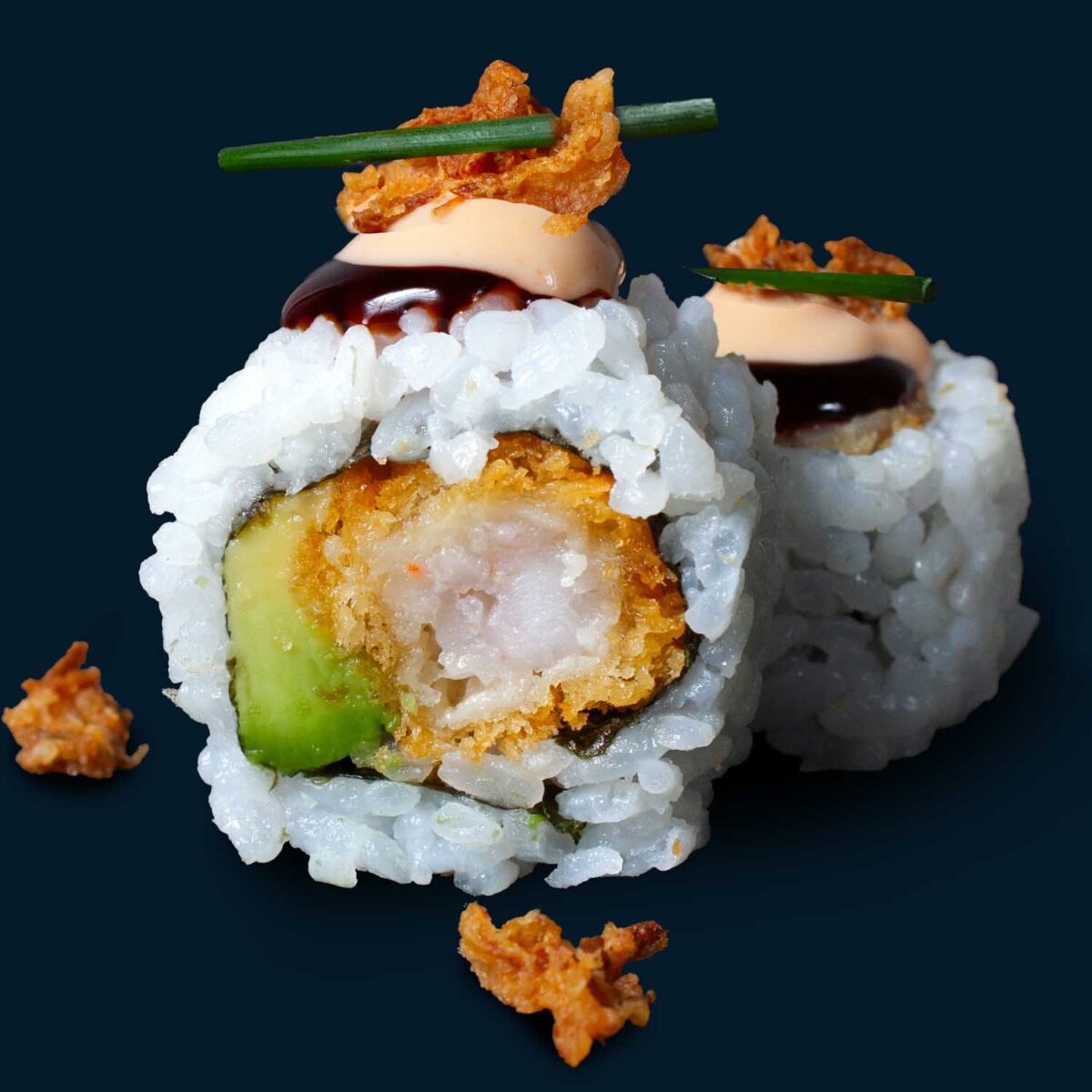 frittierte Garnele, Röstzwiebeln, Avocado Rucola mit hausgemachter Teriyaki Sauce, hausgemachter Spicy Mayo und Schnittlauch